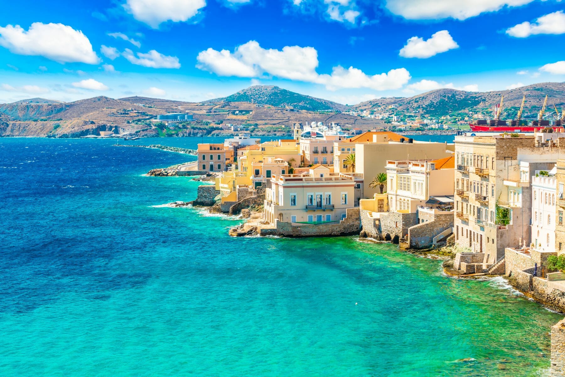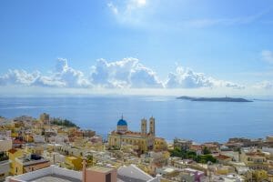 Syros is located in the very core of the Cyclades, 83 nautical miles off the Port of Piraeus and 62 nautical miles off the Port of Rafina. It has an overall surface of 84,069 square kilometers. The ferry ride to Syros lasts no longer than 4 hours and less than 3 hours by the modern, faster ferries. Syros is surrounded by the islands of Andros, Tinos, Mykonos, Naxos, and Paros to the east, by the islands of Sifnos, Serifos, Kythnos, and Kea to the west, and by the island of Gyaros to the north. Gazing out on that island cluster from the top of the hill of Ano Syros makes you understand instantly why Syros grew to be the administrative, commercial, intellectual, and cultural hub of the Cyclades.