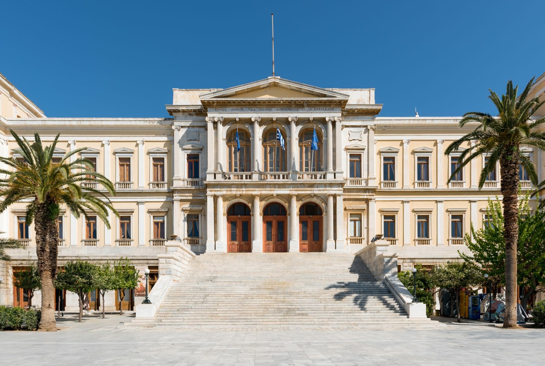 The building’s outstanding features include a princely staircase 15.5 meters high; two wings with five vertical window axes right and left, overhangs, towers, a marble pediment, portraits of former Syros mayors, and more.