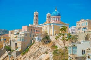 Syros has a population of approximately 20 thousand Greek Orthodox as well as Catholic people. Hermoupolis, its capital city, is known as “The Lady of the Aegean Sea”. Built amphitheatrically on the hills embracing its port, Hermoupolis will instantly take your breath away with its imposing architectural gems: in all likelihood, it is the only classic city left in Greece. Hermoupolis was born and created within the blaze of the greek revolution in 1821 by refugees to save their lives from the Turkish massacre. Its architecture bears witness to the island’s history and, starting in ancient times, continues to the present. It masterfully combines the old with the new, the classical with the modern.